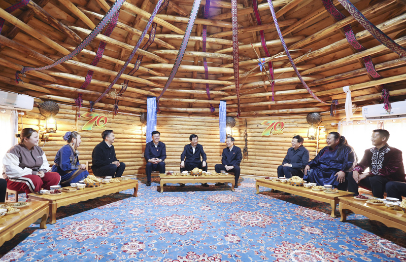9月27日,受习近平总书记嘱托,中共中央政治局常委、全国政协主席、中央代表团团长王沪宁带领中央代表团部分成员到阿勒泰地区布尔津县考察。这是王沪宁和中央代表团部分成员在扎拉特乡村旅游专业合作社同村民交流。新华社记者 姚大伟 摄