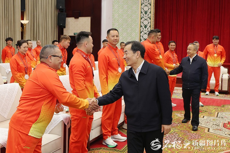 12月4日,自治区党委书记陈小江、自治区主席艾尔肯·吐尼亚孜在乌鲁木齐会见载誉归来的第十五届全国运动会新疆体育代表团获奖运动员、教练员代表。石榴云/新疆日报记者崔志坚摄