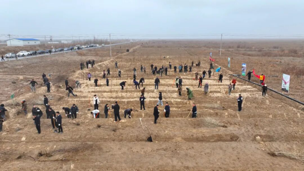 疏勒县义务植树活动现场,干部职工协作井然有序,共筑生态屏障。