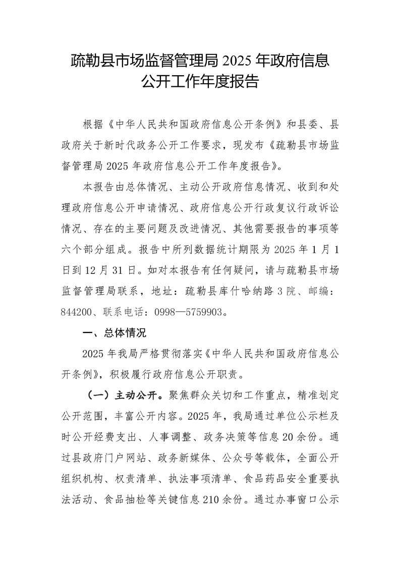 疏勒县市场监督管理局2025年政府信息公开工作年度报告