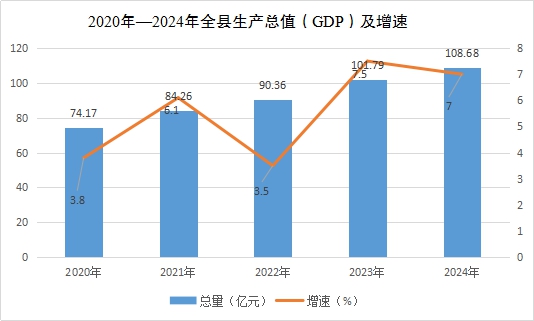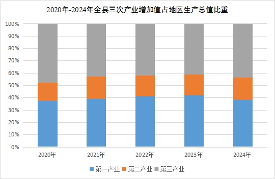 根据地区统计局统一核算,2024年,疏勒县实现地区生产总值(GDP)108.68亿元,比上年增长7%。其中:第一产业增加值41.58亿元,比上年增长4.8%;第二产业增加值19.71亿元,比上年增长11.4%;第三产业增加值47.39亿元,比上年增长7.2%。第一产业增加值占地区生产总值的比重为38.3%,第二产业增加值占地区生产总值的比重为18.1%,第三产业增加值占地区生产总值的比重为43.6%。