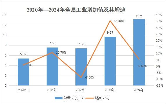全年全部工业增加值13.2亿元,比上年增长5.6%。其中,规模以上工业增加值8.27亿元,比上年增长6.9%。在规模以上工业中,按经济类型划分,国有控股企业增加值比上年增长30.8%,股份制企业增加值比上年增长6.9%,私有企业增加值比上年下降5.6%。按工业三大门类划分,制造业比上年增长3.5%,电力、热力、燃气和水的生产和供应业比上年增长34.8%。按轻重工业划分,轻工业比上年增长1%,重工业比上年增长8.7%。