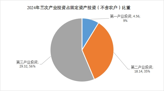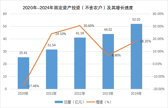 全年固定资产投资(不含农户)52.02亿元,比上年增长18.2%。其中:第一产业投资4.56亿元,比上年下降14.8%;第二产业投资18.14亿元,比上年下降18.8%;第三产业投资29.32亿元,比上年增长119.6%。基础设施投资12.21亿元,比上年下降32.6%。民间投资27.48亿元,比上年增长205.1%。