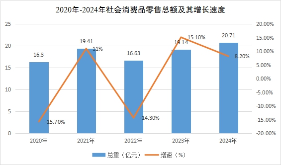 全年社会消费品零售总额20.71亿元,比上年增长8.2%。其中:限额以上社会消费品零售总额13.24亿元,比上年增长4.75%。按经营地统计,城镇限额以上社会消费品零售总额10.9亿元,比上年下降4.8%;乡村限额以上社会消费品零售总额2.34亿元,比上年增长94.8%。城镇消费品市场居于主导地位,占限额以上社会消费品零售总额的82.33%。按消费类型统计,限额以上商品零售额12.86亿元,比上年增长5.7%;限额以上餐饮收入0.38亿元,比上年下降25%。