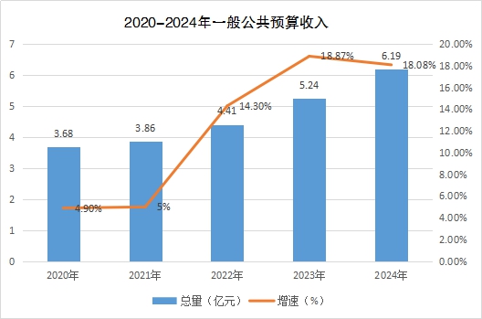 全年一般公共预算收入完成6.19亿元,比上年增长18.08%;其中:税收收入3.6亿元,比上年增长5.8%,一般公共预算支出49.74亿元,比上年下降7.27%。